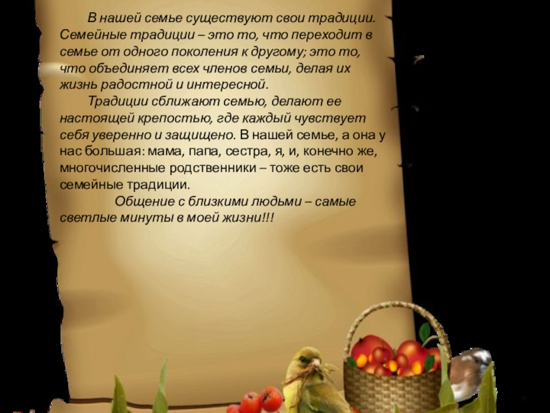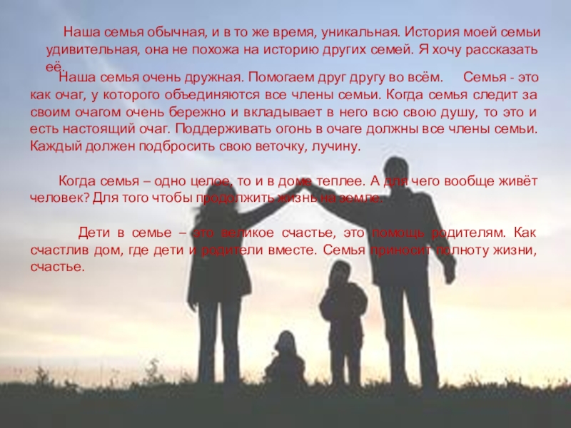 Наша семья очень дружная. Помогаем друг другу во всём. Семья - это как очаг, у которого объединяются все члены семьи. Когда семья следит за своим очагом очень бережно и вкладывает в него всю свою душу, то это и есть настоящий очаг. Поддерживать огонь в очаге должны все члены семьи. Каждый должен подбросить свою веточку, лучину.
