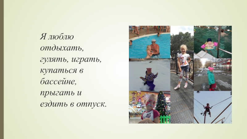 Я люблю отдыхать, гулять, играть, купаться в бассейне, прыгать и ездить в отпуск.