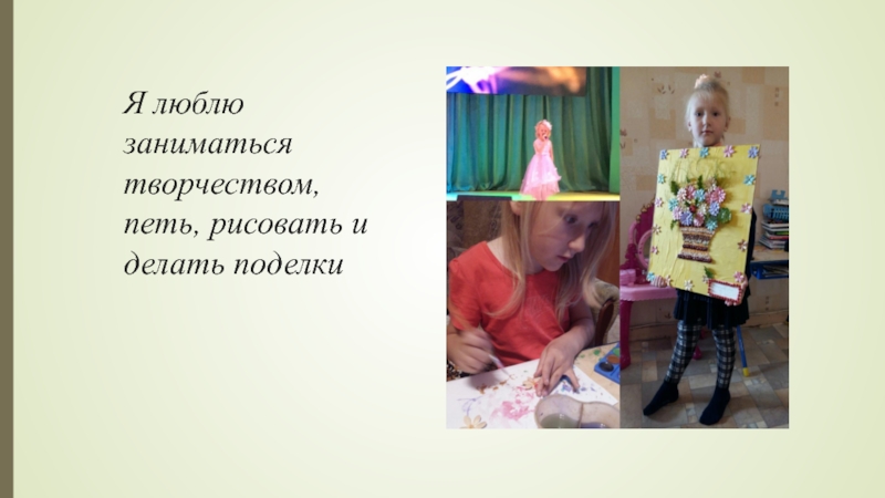 Слайд 3Я люблю заниматься творчеством, петь, рисовать и делать поделки