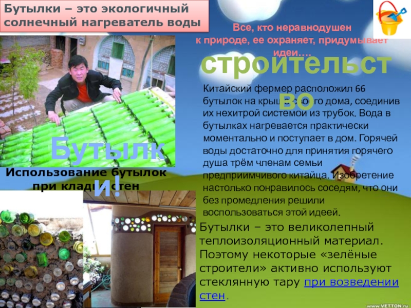 Бутылки – это великолепный теплоизоляционный материал. Поэтому некоторые «зелёные строители» активно используют стеклянную тару при возведении стен.
