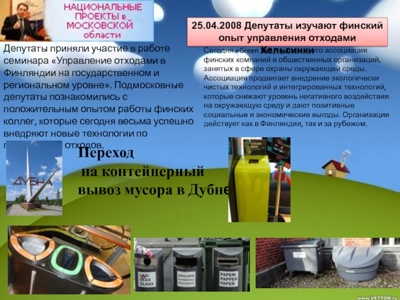 Сегодня «Green Net Finland» — это ассоциация финских компаний и общественных организаций, занятых в сфере охраны окружающей среды. Ассоциация продвигает внедрение экологически чистых технологий и интегрированных технологий, которые снижают уровень негативного воздействия на окружающую среду и дают позитивные социальные и экономические выгоды. Организация действует как в Финляндии, так и за рубежом.