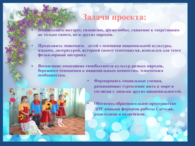 Воспитывать интерес, симпатию, дружелюбие, уважение к сверстникам не только своего, но и других народов.