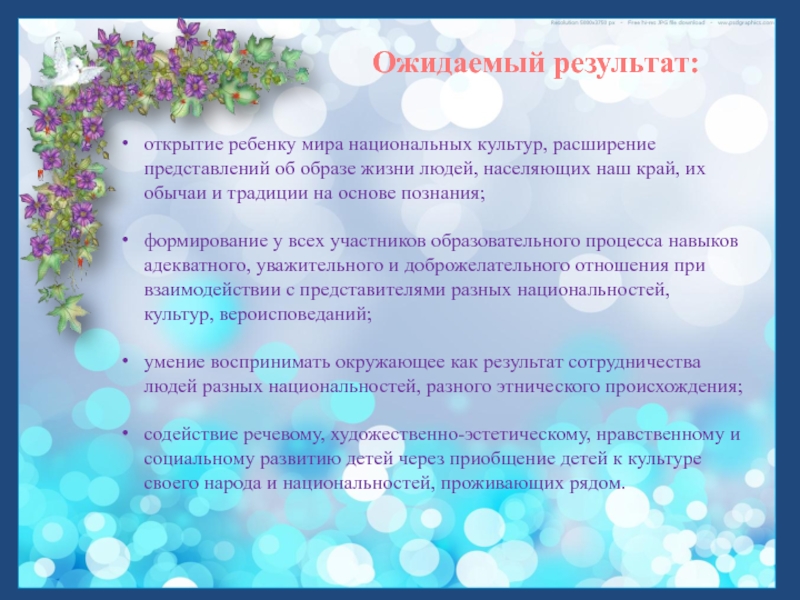 Воспитание понимания самобытности культур разных народов, бережного отношения к национальным ценностям, этническим особенностям.