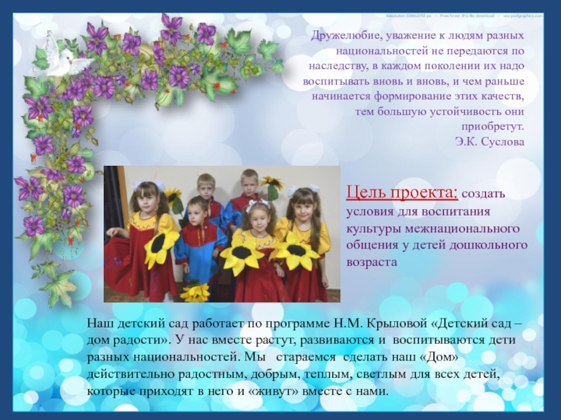 Наш детский сад работает по программе Н.М. Крыловой «Детский сад – дом радости». У нас вместе растут, развиваются и воспитываются дети разных национальностей. Мы стараемся сделать наш «Дом» действительно радостным, добрым, теплым, светлым для всех детей, которые приходят в него и «живут» вместе с нами.