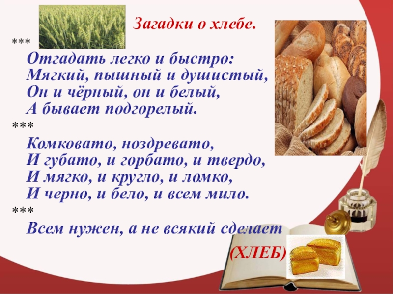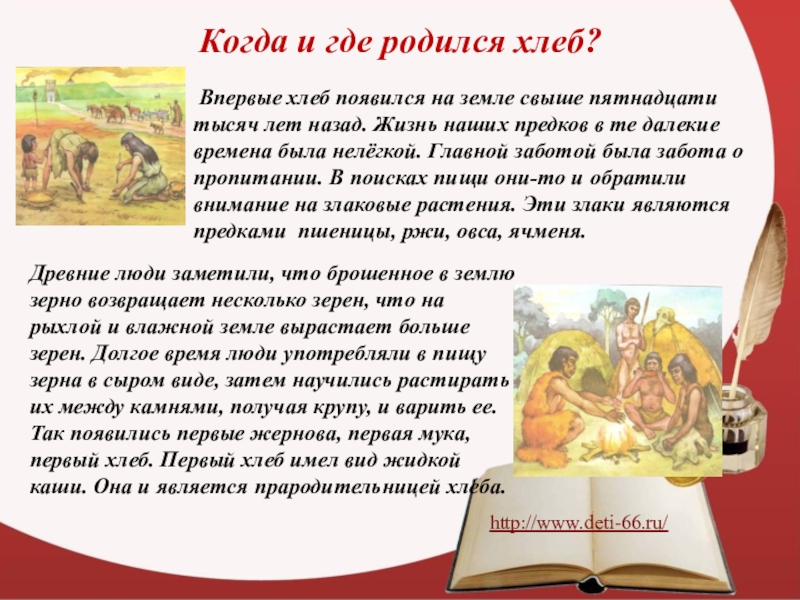 Древние люди заметили, что брошенное в землю зерно возвращает несколько зерен, что на рыхлой и влажной земле вырастает больше зерен. Долгое время люди употребляли в пищу зерна в сыром виде, затем научились растирать их между камнями, получая крупу, и варить ее. Так появились первые жернова, первая мука, первый хлеб. Первый хлеб имел вид жидкой каши. Она и является прародительницей хлеба.