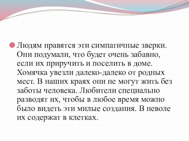 если их приручить и поселить в доме. Хомячка увезли далеко-далеко от родных мест. В наших краях они не могут жить без заботы человека. Любители специально разводят их, чтобы в любое время можно было видеть эти милые создания. В неволе их содержат в клетках.