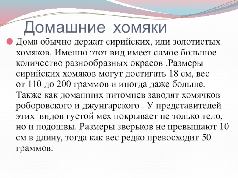 имеет самое большое количество разнообразных окрасов .Размеры сирийских хомяков могут достигать 18 см, вес — от 110 до 200 граммов и иногда даже больше. Также как домашних питомцев заводят хомячков роборовского и джунгарского . У представителей этих видов густой мех покрывает не только тело, но и подошвы. Размеры зверьков не превышают 10 см в длину, тогда как вес редко превосходит 50 граммов.