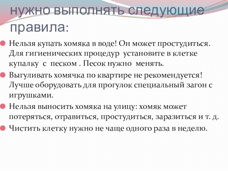 Слайд 20Чтобы хомячки не болели нужно выполнять следующие правила: