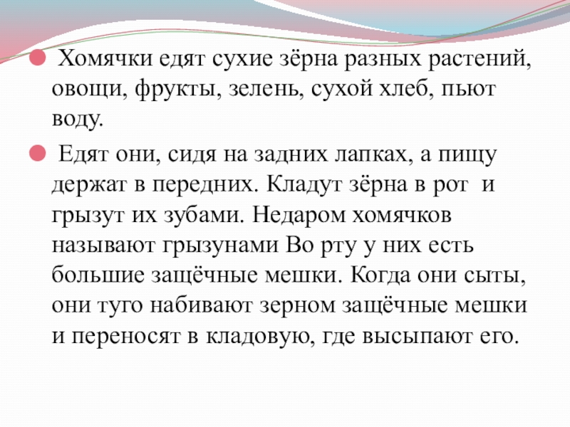 Едят они, сидя на задних лапках, а пищу держат в передних. Кладут зёрна в рот и грызут их зубами. Недаром хомячков называют грызунами Во рту у них есть большие защёчные мешки. Когда они сыты, они туго набивают зерном защёчные мешки и переносят в кладовую, где высыпают его.