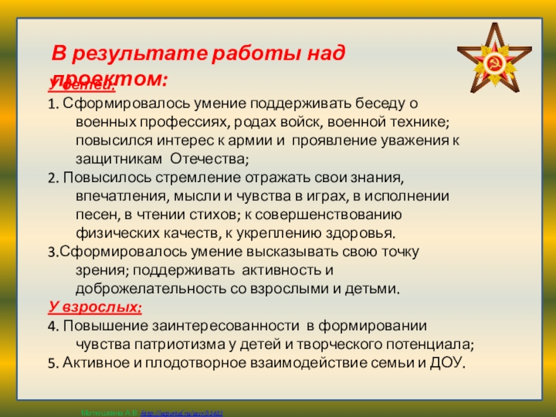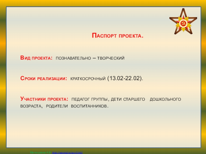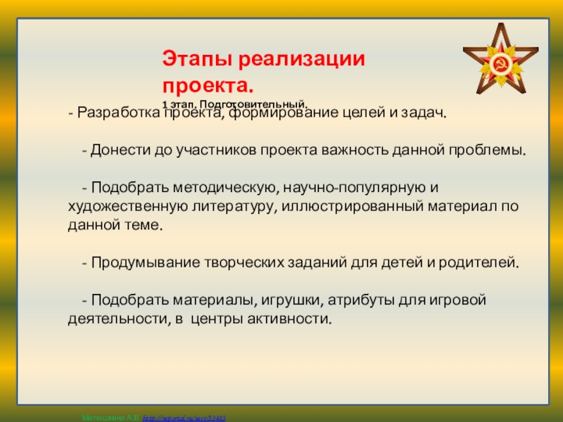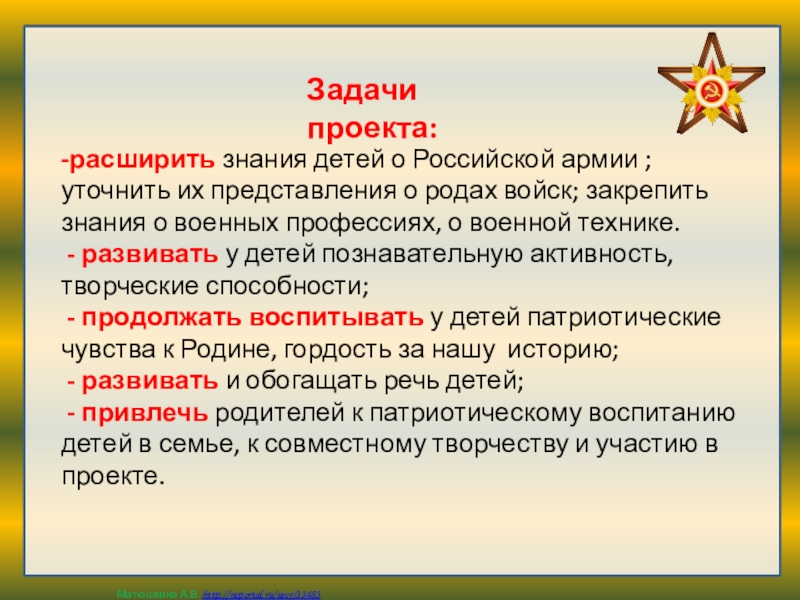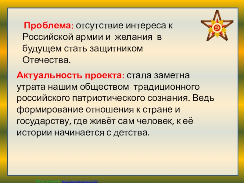 Актуальность проекта: стала заметна утрата нашим обществом традиционного российского патриотического сознания. Ведь формирование отношения к стране и государству, где живёт сам человек, к её истории начинается с детства.