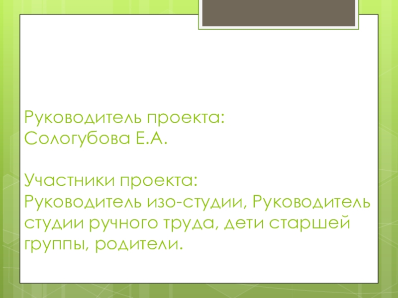 Слайд 2Руководитель проекта: Сологубова Е.А. Участники проекта: Руководитель изо-студии, Руководитель студии ручного труда, дети
