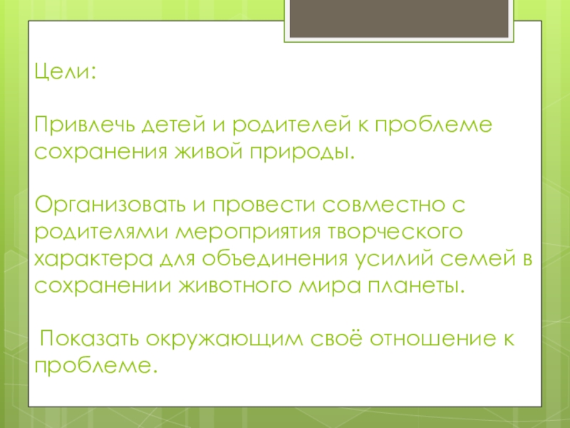 Слайд 4Цели: Привлечь детей и родителей к проблеме сохранения живой природы. Организовать