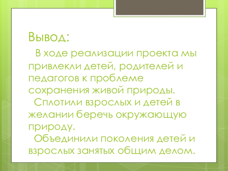 Вывод:   В ходе реализации проекта мы привлекли детей, родителей и педагогов к проблеме сохранения живой