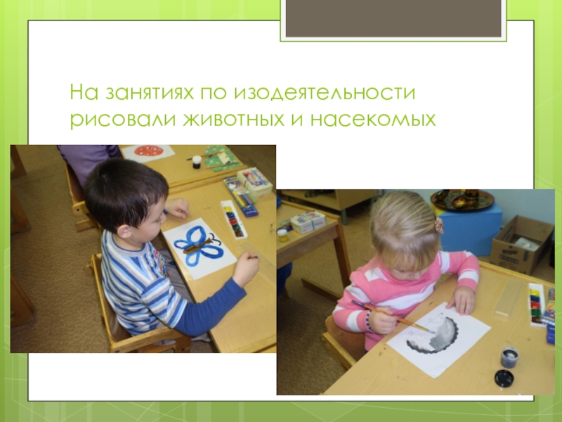 Слайд 12На занятиях по изодеятельности рисовали животных и насекомых