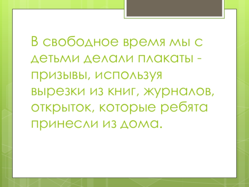 Слайд 19 В свободное время мы с детьми делали плакаты - призывы, используя