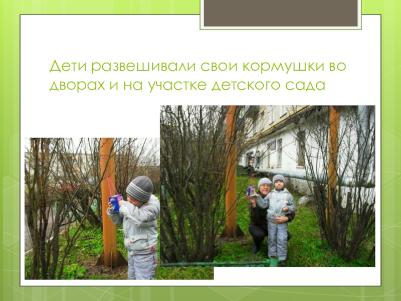 Слайд 10Дети развешивали свои кормушки во дворах и на участке детского сада