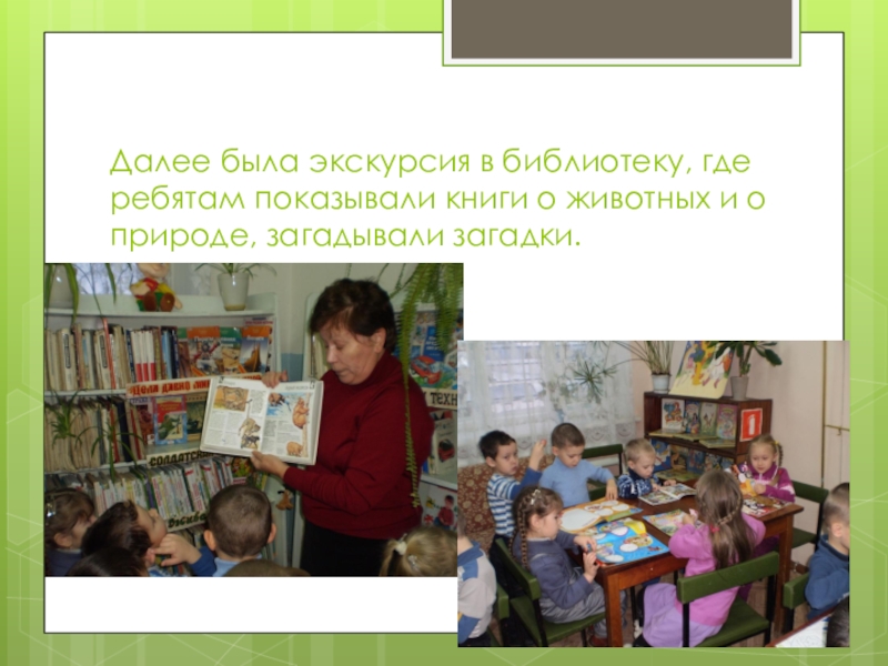 Слайд 14Далее была экскурсия в библиотеку, где ребятам показывали книги о животных