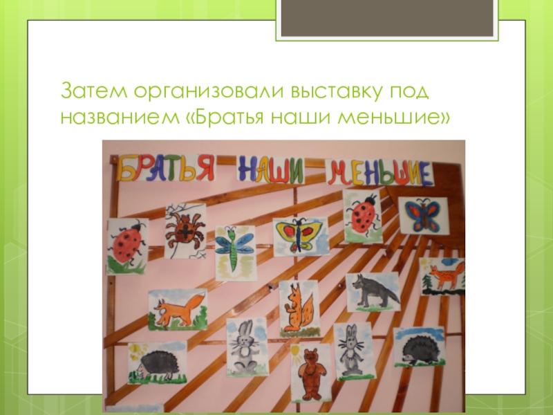 Слайд 13Затем организовали выставку под названием «Братья наши меньшие»