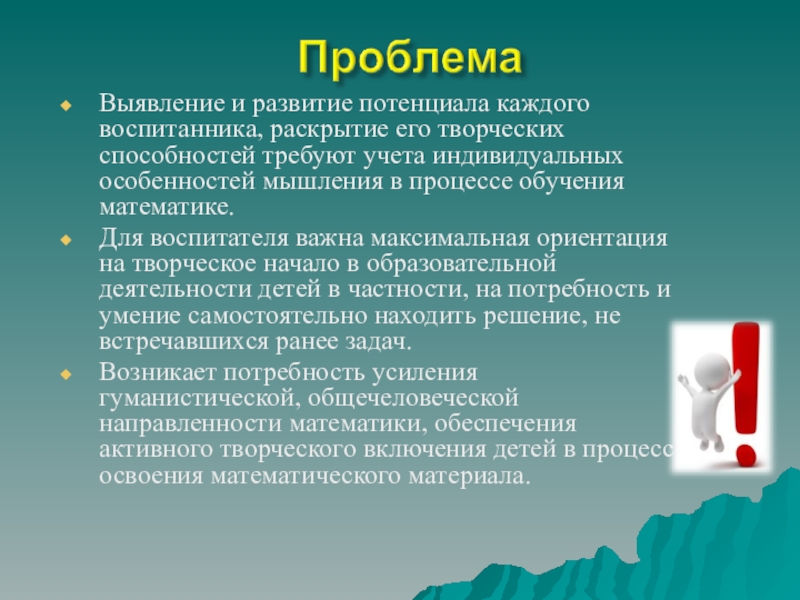 Возникает потребность усиления гуманистической, общечеловеческой направленности математики, обеспечения активного творческого включения детей в процесс освоения математического материала.