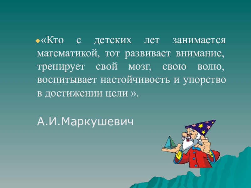 Слайд 2«Кто с детских лет занимается математикой, тот развивает внимание, тренирует свой