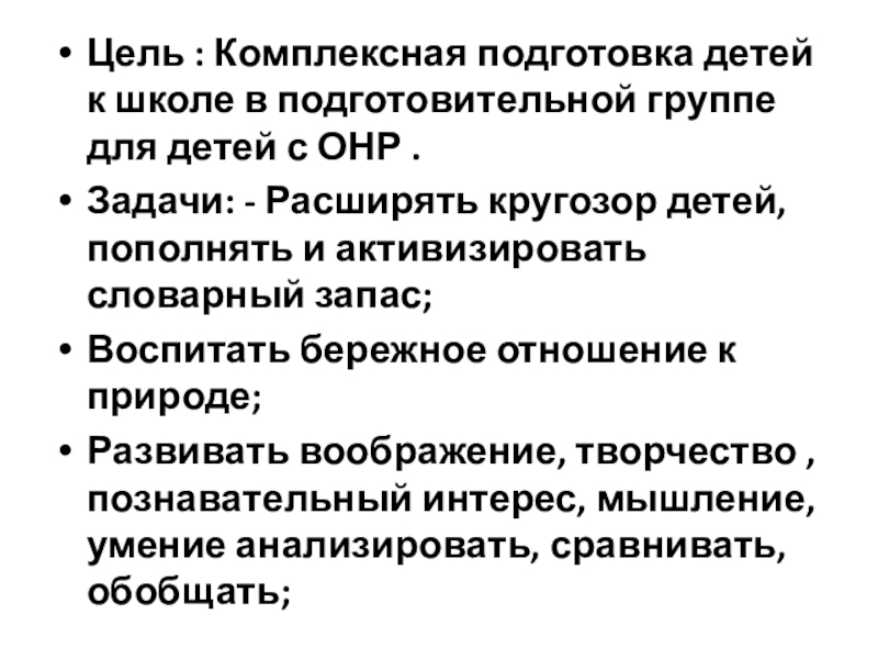 Цель : Комплексная подготовка детей к школе в подготовительной группе для детей с ОНР .Задачи: - Расширять