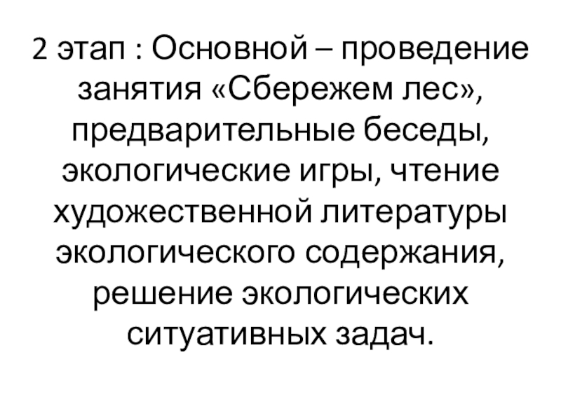 Слайд 7 2 этап : Основной – проведение занятия «Сбережем лес», предварительные беседы,