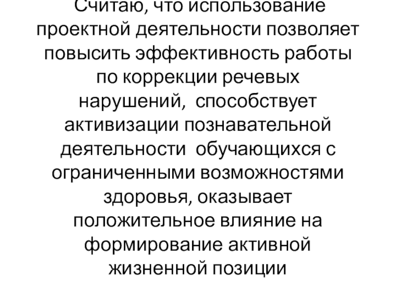 Считаю, что использование проектной деятельности позволяет повысить эффективность работы по коррекции речевых нарушений,  способствует активизации