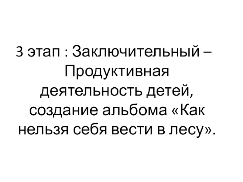3 этап : Заключительный – Продуктивная деятельность детей, создание альбома «Как нельзя себя вести в лесу».