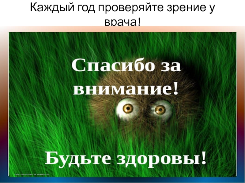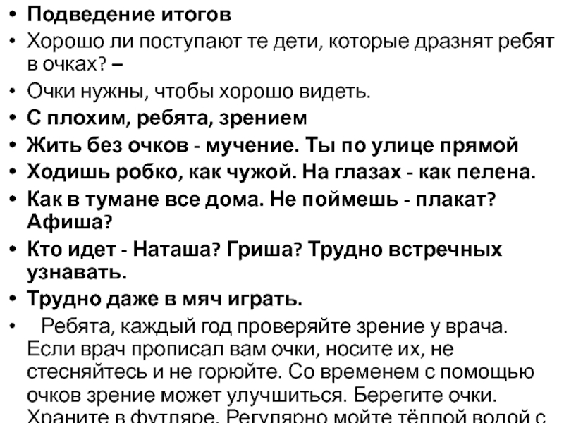 Ребята, каждый год проверяйте зрение у врача. Если врач прописал вам очки, носите их, не стесняйтесь и не горюйте. Со временем с помощью очков зрение может улучшиться. Берегите очки. Храните в футляре. Регулярно мойте тёплой водой с мылом. Снимайте во время занятий спортом. А если ваше зрение хорошее - берегите его!