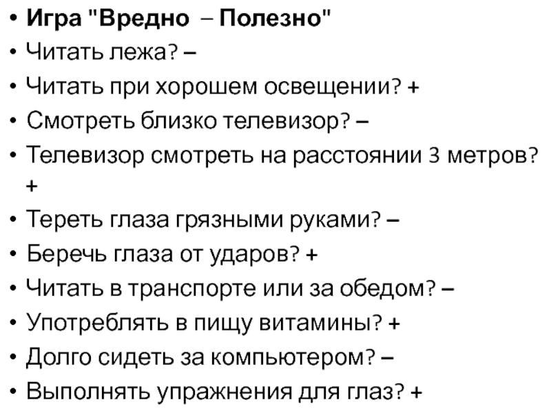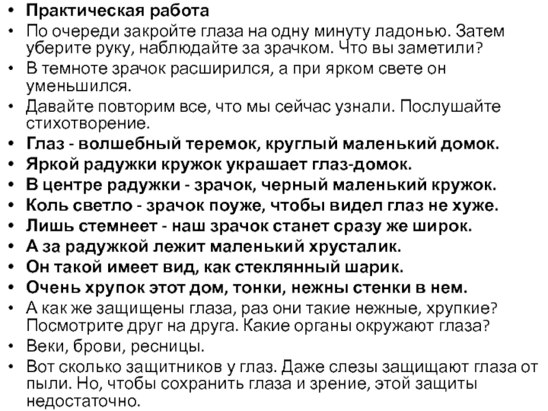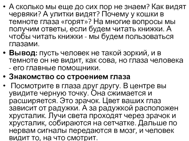 червяки? А улитки видят? Почему у кошки в темноте глаза «горят»? На многие вопросы мы получим ответы, если будем читать книжки. А чтобы читать книжки - мы будем пользоваться глазами.