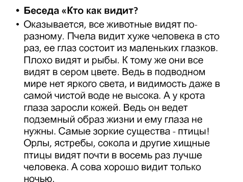 человека в сто раз, ее глаз состоит из маленьких глазков. Плохо видят и рыбы. К тому же они все видят в сером цвете. Ведь в подводном мире нет яркого света, и видимость даже в самой чистой воде не высока. А у крота глаза заросли кожей. Ведь он ведет подземный образ жизни и ему глаза не нужны. Самые зоркие существа - птицы! Орлы, ястребы, сокола и другие хищные птицы видят почти в восемь раз лучше человека. А сова хорошо видит только ночью.