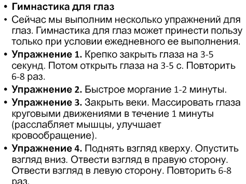 Сейчас мы выполним несколько упражнений для глаз. Гимнастика для