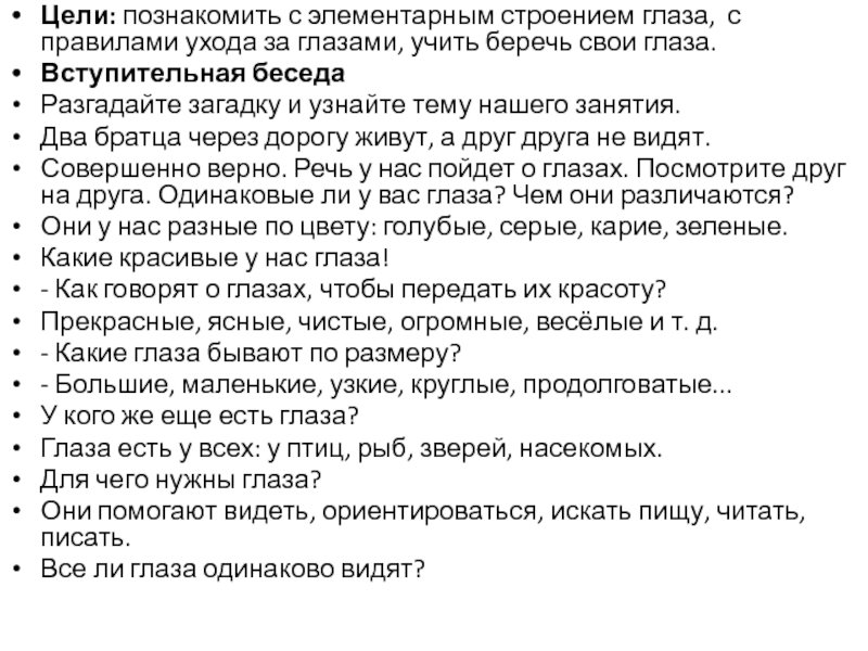 Совершенно верно. Речь у нас пойдет о глазах. Посмотрите друг на друга. Одинаковые ли у вас глаза? Чем они различаются?