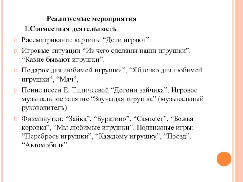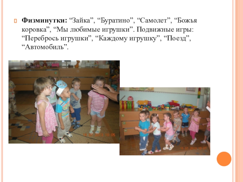Физминутки: “Зайка”, “Буратино”, “Самолет”, “Божья коровка”, “Мы любимые игрушки”. Подвижные игры: “Перебрось игрушки”, “Каждому игрушку”, “Поезд”, “Автомобиль”.