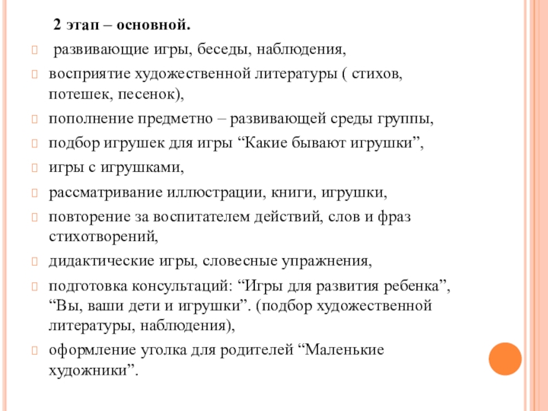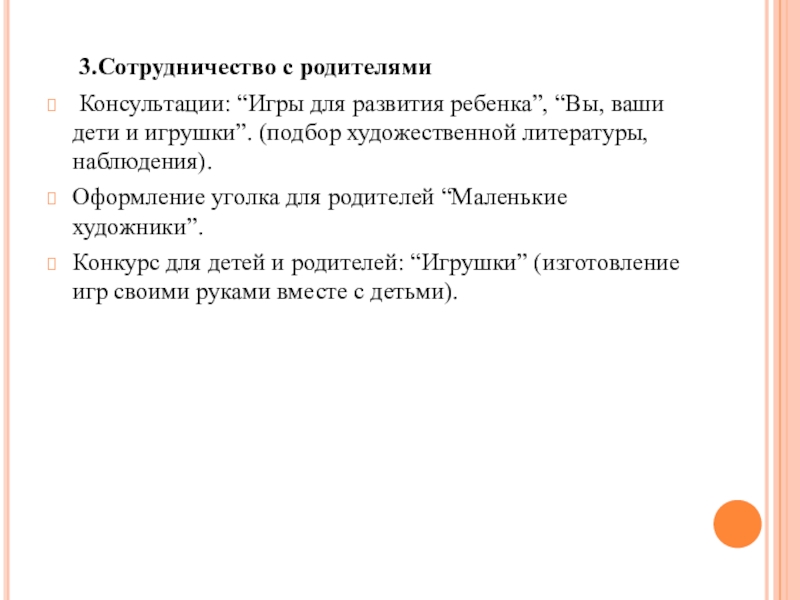 подготовка консультаций: “Игры для развития ребенка”, “Вы, ваши дети и игрушки”. (подбор художественной литературы, наблюдения),