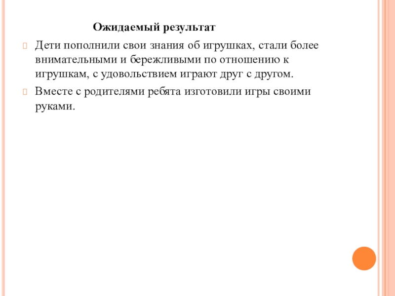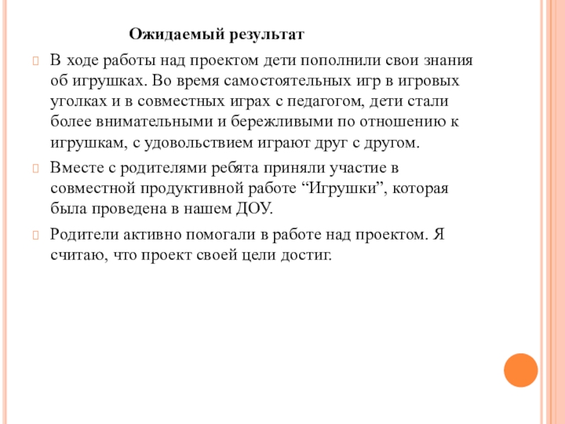 В ходе работы над проектом дети пополнили свои знания об игрушках. Во время самостоятельных игр в игровых уголках и в совместных играх с педагогом, дети стали более внимательными и бережливыми по отношению к игрушкам, с удовольствием играют друг с другом.