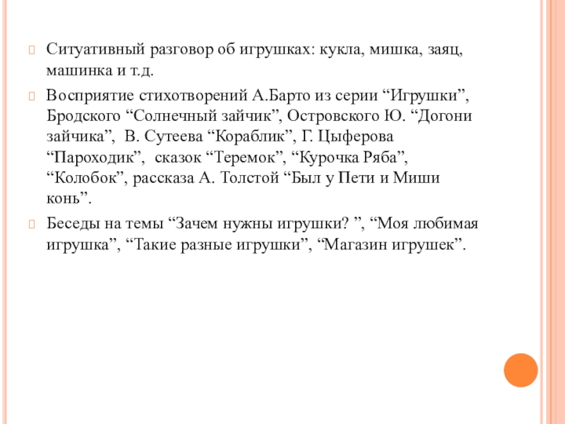 А.Барто из серии “Игрушки”, Бродского “Солнечный зайчик”, Островского Ю. “Догони зайчика”, В. Сутеева “Кораблик”, Г. Цыферова “Пароходик”, сказок “Теремок”, “Курочка Ряба”, “Колобок”, рассказа А. Толстой “Был у Пети и Миши конь”.