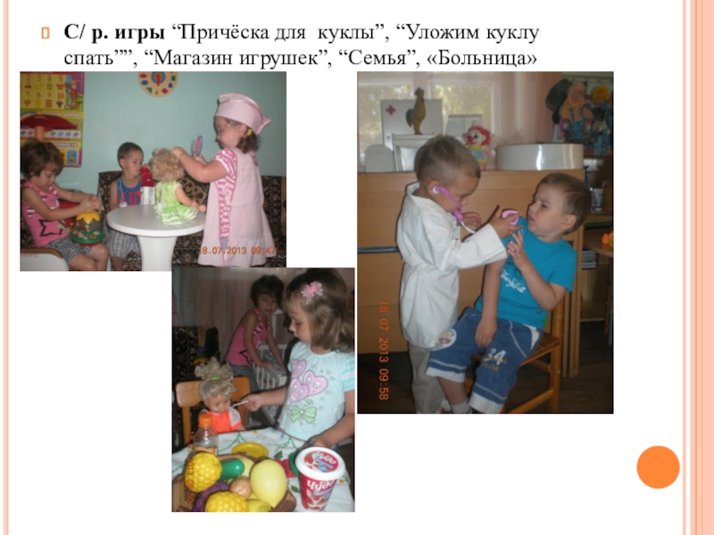 Слайд 13С/ р. игры “Причёска для куклы”, “Уложим куклу спать””, “Магазин игрушек”, “Семья”,