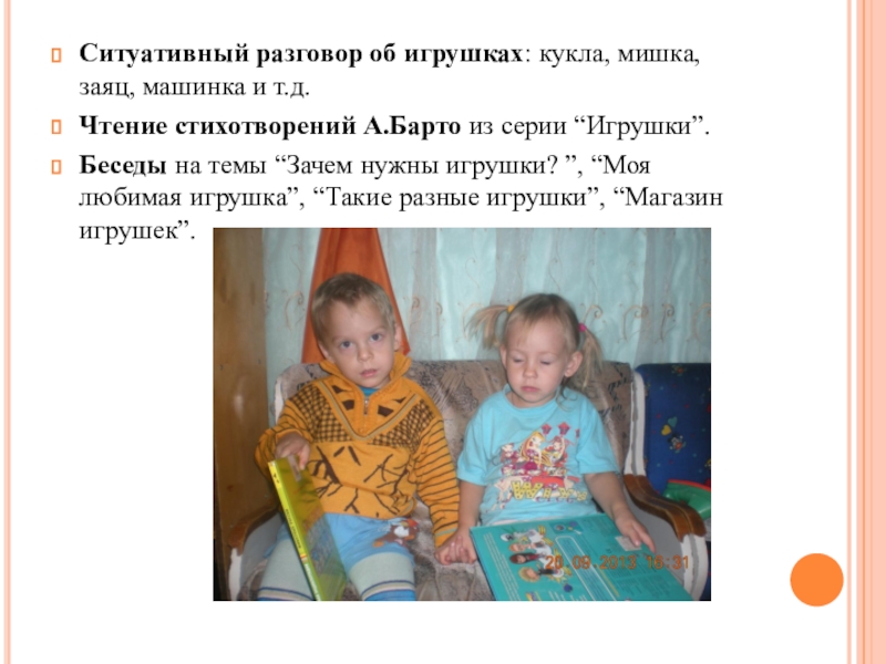 Слайд 16Ситуативный разговор об игрушках: кукла, мишка, заяц, машинка и т.д.