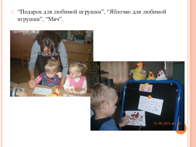 Слайд 19“Подарок для любимой игрушки”, “Яблочко для любимой игрушки”, “Мяч”.