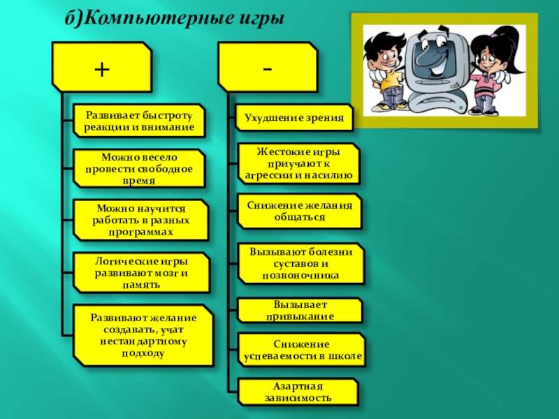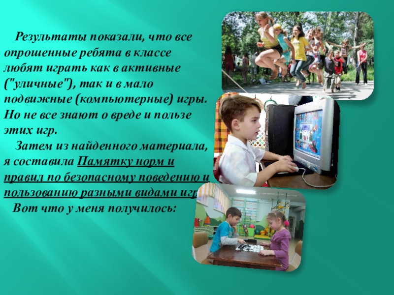 любят играть как в активные ("уличные"), так и в мало подвижные (компьютерные) игры. Но не все знают о вреде и пользе этих игр.