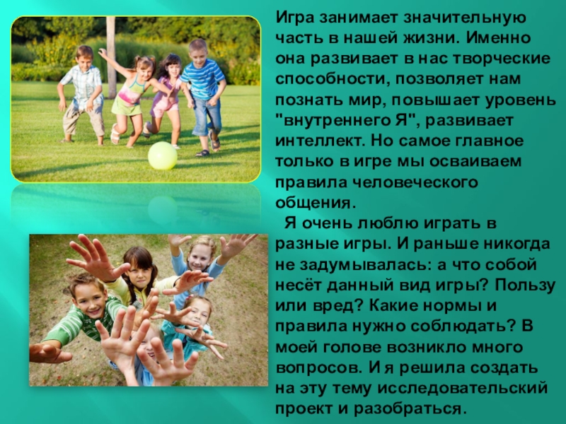 Я очень люблю играть в разные игры. И раньше никогда не задумывалась: а что собой несёт данный вид игры? Пользу или вред? Какие нормы и правила нужно соблюдать? В моей голове возникло много вопросов. И я решила создать на эту тему исследовательский проект и разобраться.