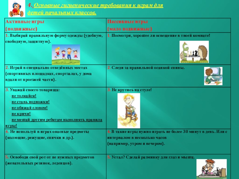 4. Основные гигиенические требования к играм для детей начальных классов.