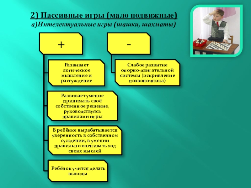 2) Пассивные игры (мало подвижные)а)Интелектуальные игры (шашки, шахматы)