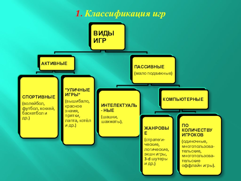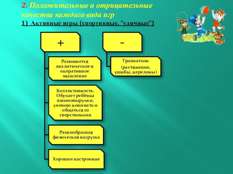2. Положительные и отрицательныекачества каждого вида игр1) Активные игры (спортивные,