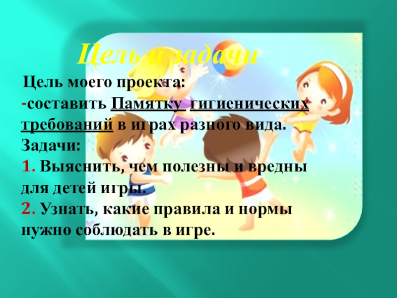 Цель и задачи Цель моего проекта:-составить Памятку гигиенических требований в играх разного вида. Задачи: 1. Выяснить, чем