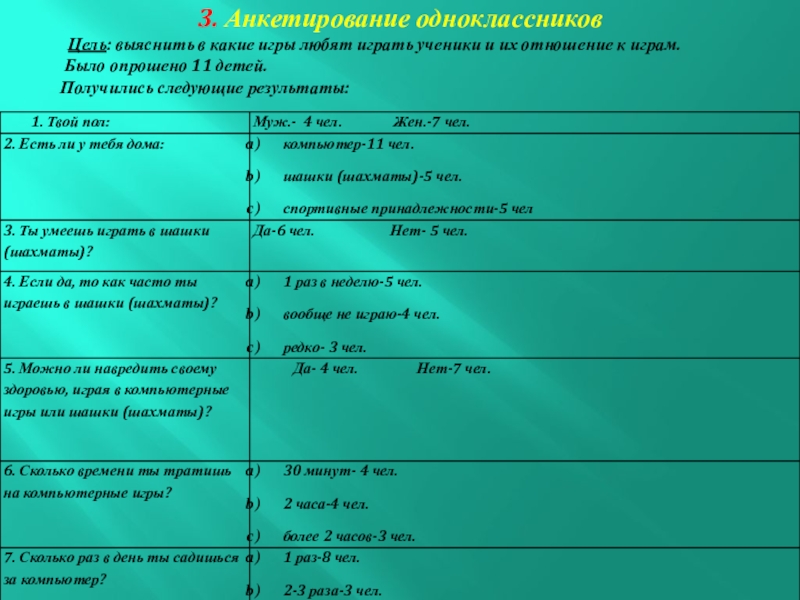 3. Анкетирование одноклассников  Цель: выяснить в какие игры любят играть ученики и их отношение к играм.