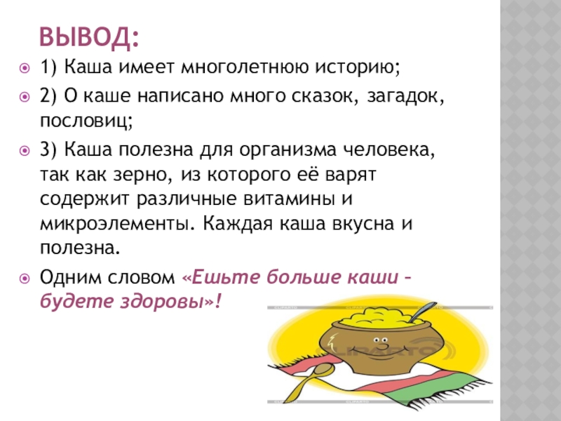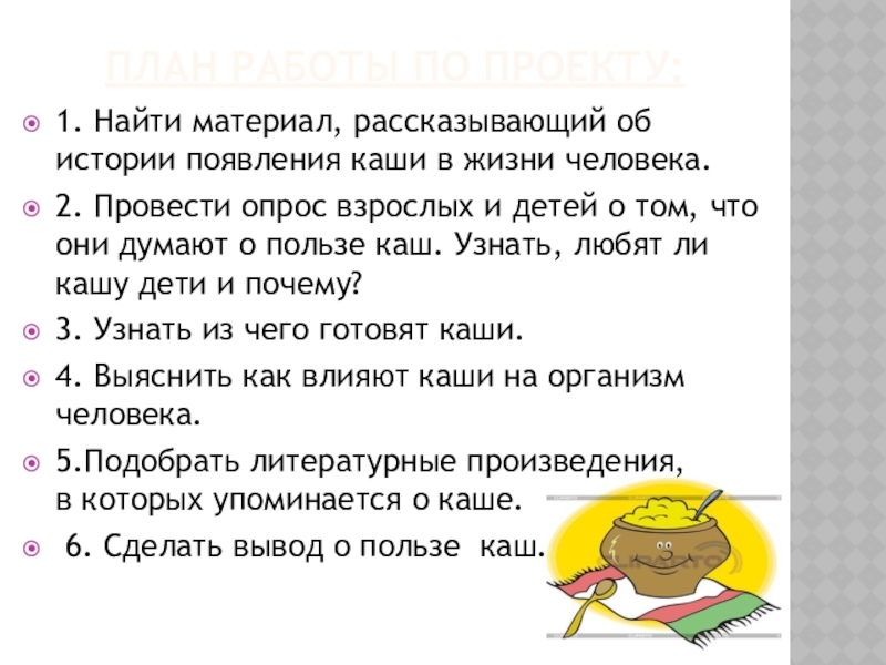 4. Собрать материал о каше, как традиционной русской еде и рассказать ребятам нашей группы.