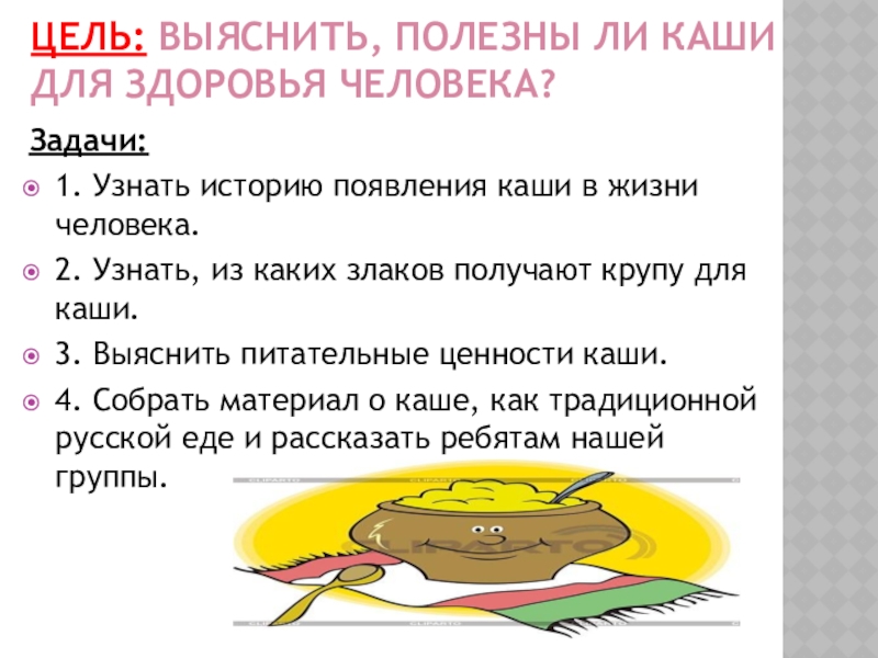 Слайд 4Цель: Выяснить, полезны ли каши для здоровья человека?