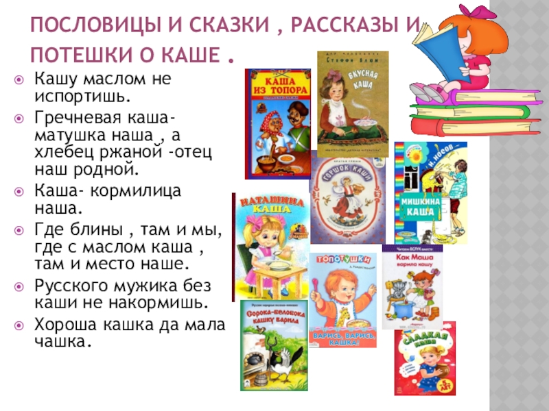 Слайд 16Пословицы и сказки , рассказы и потешки о каше .